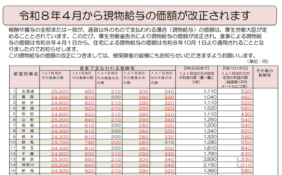 「令和8年度の現物給与の価額」が決定